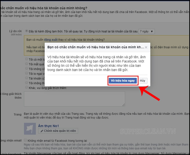 Bước 6: Một thông báo xuất hiện xác định chắc chắn bạn muốn vô hiệu hóa tài khoản, bạn chỉ cần chọn “Vô hiệu hóa ngay” là được.