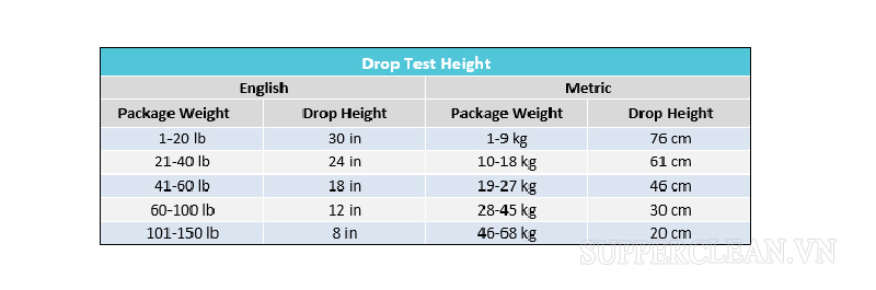 – Bước 3: Cân trọng lượng của thùng để xác định chiều cao tiêu chuẩn thử nghiệm rơi phù hợp. Hầu hết các nhà máy đều có sẵn bảng chiều cao thử nghiệm tham khảo.