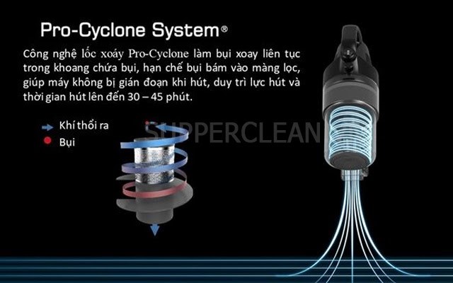 - Thêm vào đó là công nghệ hút Cyclone, tạo lực ly tâm lớn. Có thể hút các loại bụi bẩn cứng đầu mà không có tình trạng nghẽn ống xảy ra.